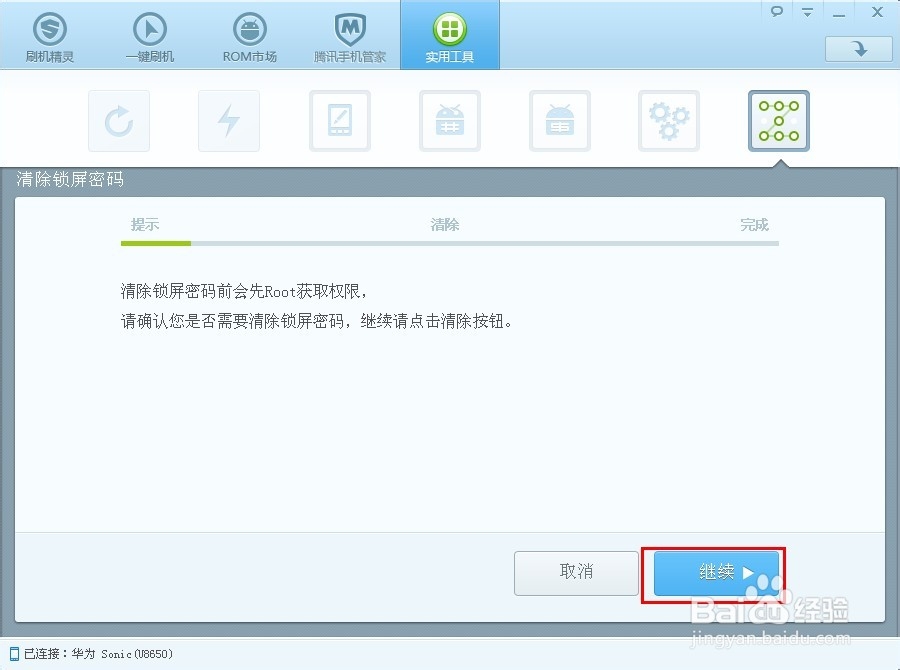 6、在打开的“清除锁屏密码”窗口中,点击“继续”以消除锁屏密码。