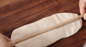 5、取一块面团,在案板上稍稍压扁,取一根筷子,在面团中间横着压一下,压出一个凹槽