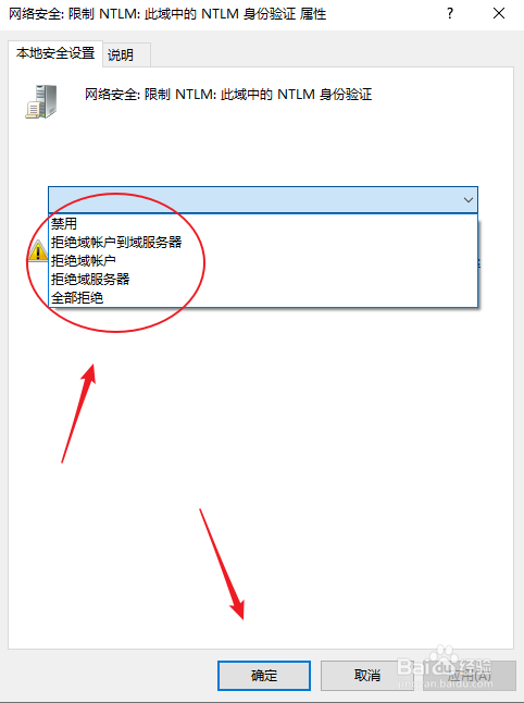 8、下拉选择一个选项后点击【确定】,设置置域中的 NTLM身份验证生效。