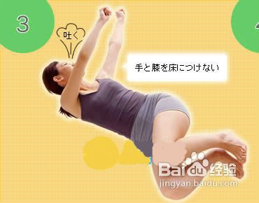 3、 3:俯卧,双腿打开与肩同宽,脚背朝下,双手交差放在腰部。吐气。