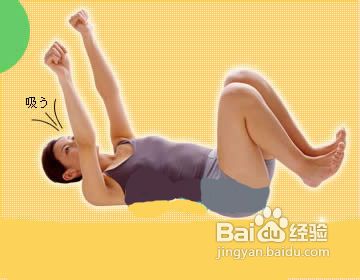 2、 2:深吸一口气,两手握拳,手臂向上伸直,同时抬起双腿,保持膝盖并拢,脚尖绷直。