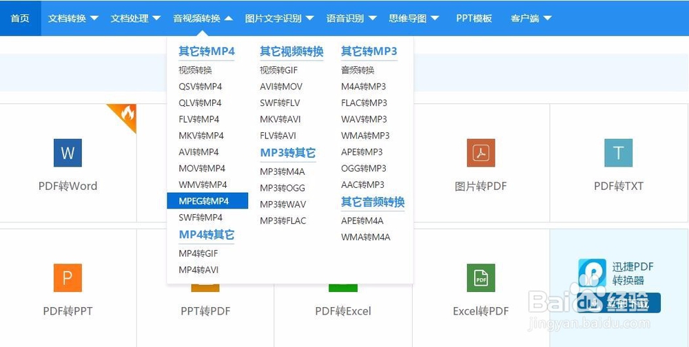 2、在首页面中我们需要找到音视频转换中的MP4格式的视频转换成mpeg格式,然后点击进入;