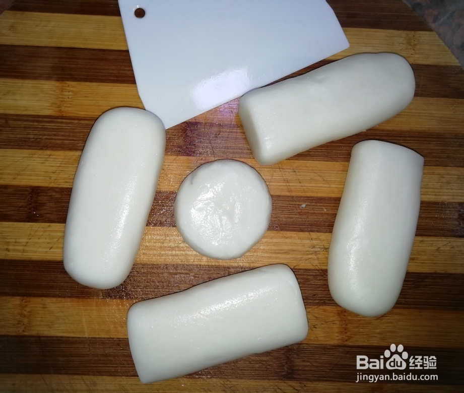 5、取出饭团(立即盖上锅盖)放在抹了油的砧板上。如果不热,在手上抹些油,迅速搓面团(注意不要烫伤)。如果破裂或干燥,加入少许油揉匀,分成几个部分,剩下一部分(放回锅内,盖上锅盖)在呈圆柱形后轻轻按压。我通常用刮刀把它按一下,然后重复操作,直到一切都好为止。