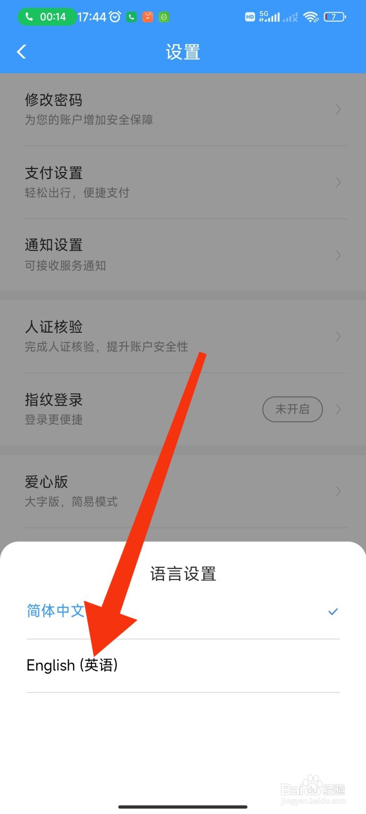 4、点击【英语】,即可将12306APP的语言设置为英文。