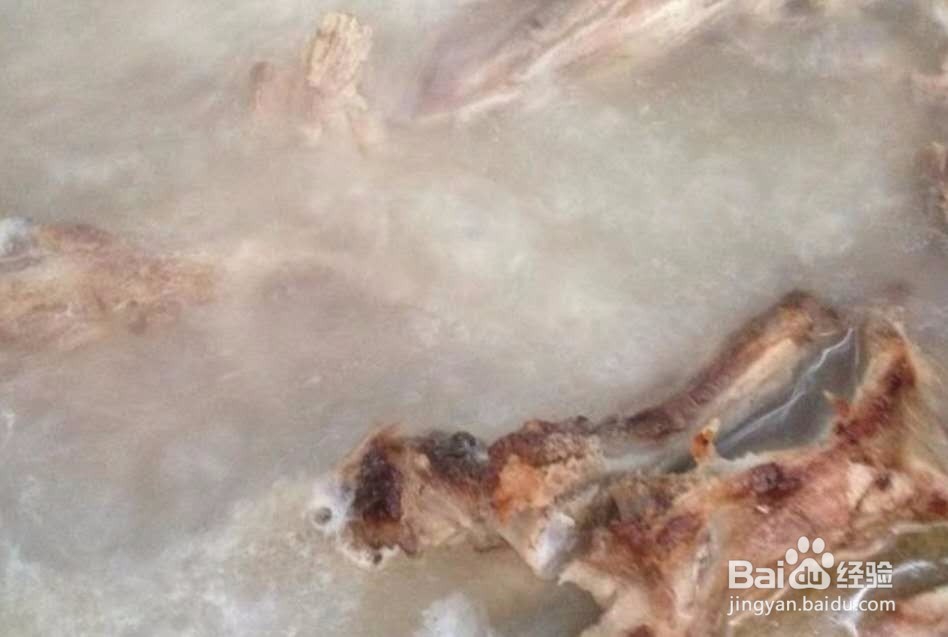 5、再把原先熬制的羊油汤倒入炒锅中,适量加些热水,盖好盖用大火熬制,一定要用大火闷才会变白,变白后出去汤上面的浮沫。