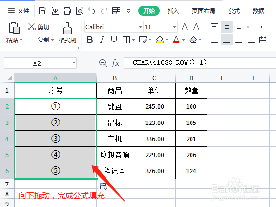 2、单击A2单元格,输入函数公式=CHAR(41688+ROW()-1)。