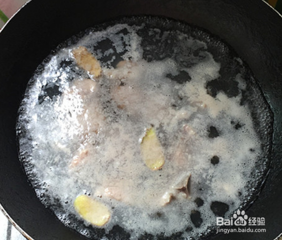 3、3.锅中加入水,放姜片和浸泡好的排骨,焯出血沫。