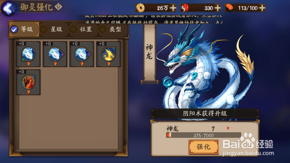4、选择相应的御灵升级的基本材料升级即可。