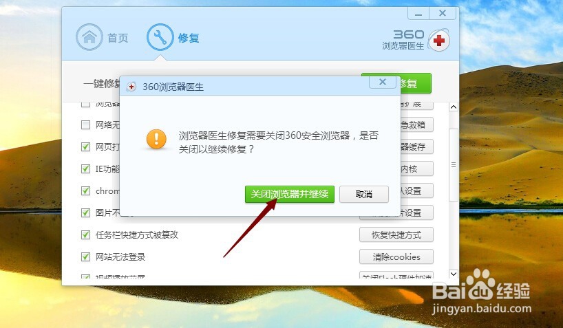 6、此时会提醒”关闭浏览器并继续“,点击此按钮即可进行浏览器的修复。希望我的经验对你有所帮助。