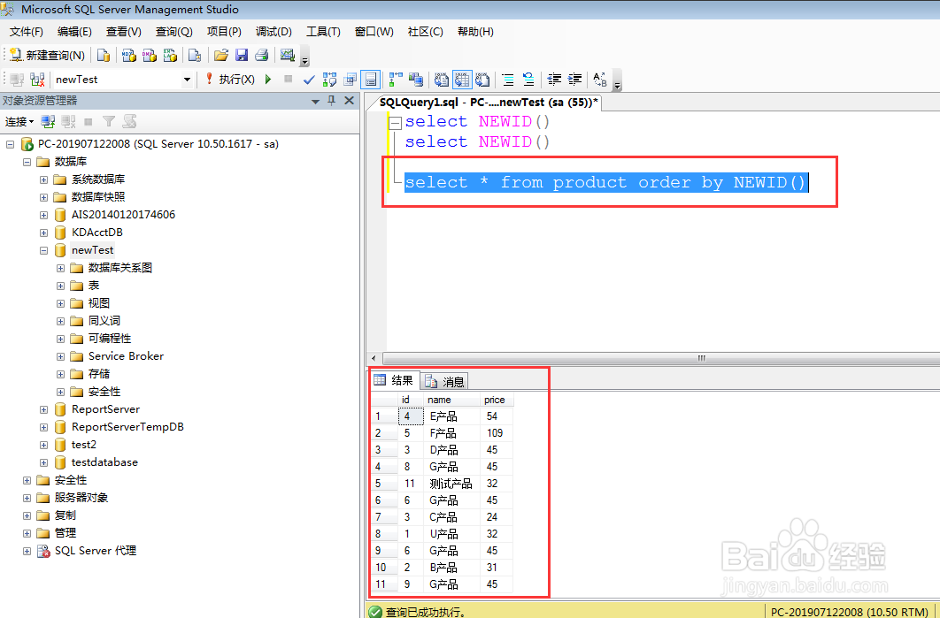 如下其结果并没有排序,这是因为newid在查询的每一行都会生成唯一的id,而rand()只计算一次结果