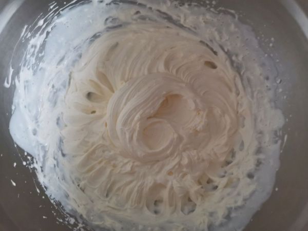 15、淡奶油加入白砂糖打发至裱花状态,装入裱花袋备用