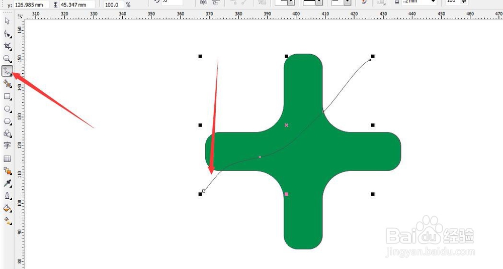 2、我想要给这个图形填充两种颜色,首先选择手绘工具,当然你可以选择任何你想要的工具,只要将这部分截断开来