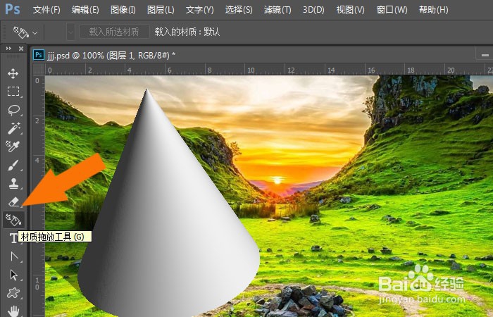 7、 然后,使用材质拖放工具,在锥形模型上单击,就添加好材质了,如下图所示。