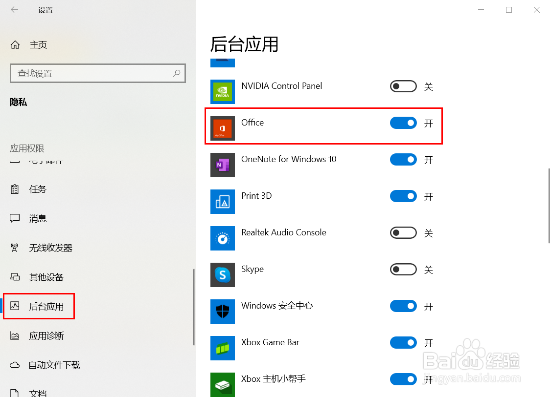 3、在隐私/后台应用列表,选择并关闭【Office】应用后台运行开关。