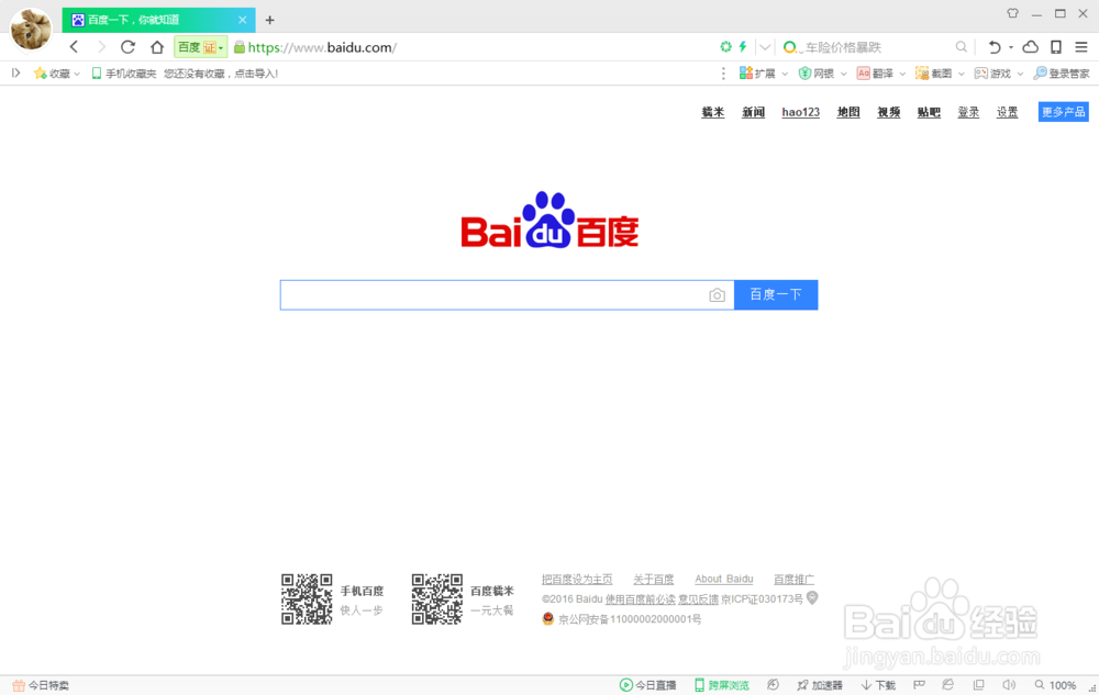 1、首先我们使用360安全浏览器8.1打开一个网页,以我为例,我打开百度(注:该浏览器现不是IE6多窗口模式,如需还原请继续往下看)。如下图所示: