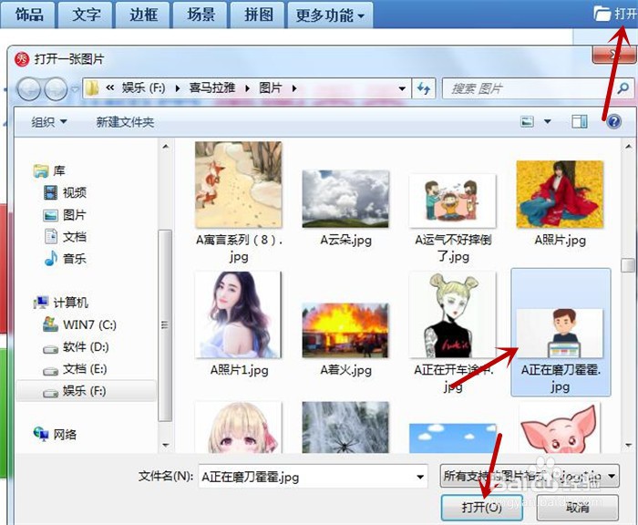1、双击打开美图秀秀软件,接着鼠标单击菜单栏右侧的打开,弹出打开一张图片窗口,将从本地电脑中选中一张图片,然后点击打开按钮