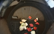 2、锅内适量油烧热,姜葱,干红辣椒炒出香味儿。