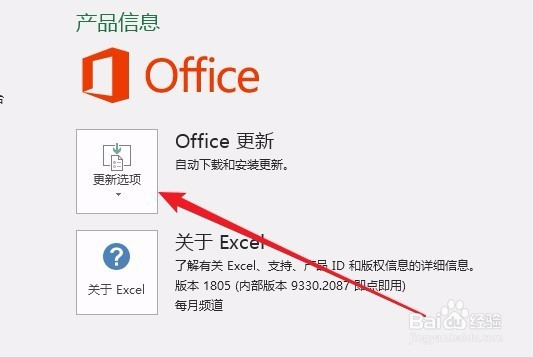 5、在右侧的产品信息窗口中,可以看到一个Office更新的图标,点击“更新选项”按钮。