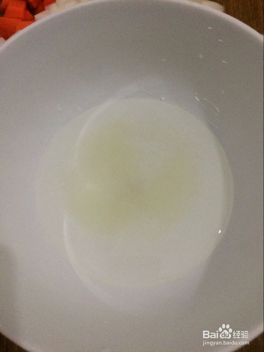 3、准备一个大点的碗,碗里放糖,放一点盐,放白醋。酸甜度自己掌握,喜欢酸甜度浓郁些就多放点糖醋。
