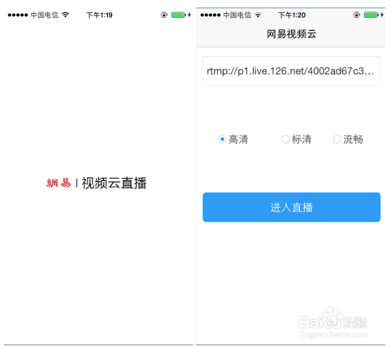 下左图是网易视频云直播端IOS Demo的欢迎界面。下右图是直播设置界面,在这个界面输入直播地址(去网易视频云官网管理控制台的频道管理页面生成),选择视频分辨率(高清、标清和流畅,其中高清640x480,标清480x360,流畅320x240,默认设置为高清,可以根据推流端当前网络状况选择其他模式,进入直播。