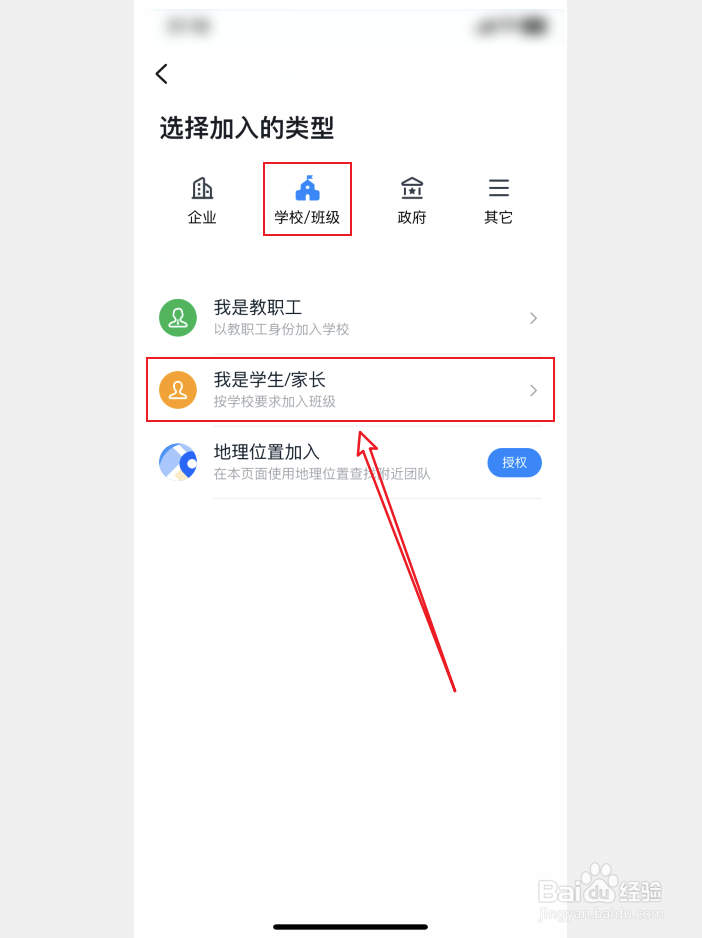 4、将‘选择加入的类型’改为【学校/班级】,选择【我是学生/家长】。