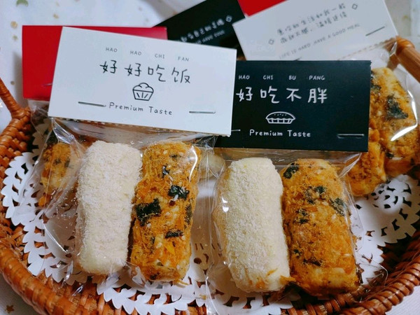 3、拿一个蛋卷裹上一层牛轧糖再裹上椰蓉奶粉,椰蓉奶酥就做好啦,外面裹上海苔肉松就是海苔肉松味的奶酥。全部裹上奶粉就是原味的奶酥。(裹的时候要快速裹凉了就不好裹外层的肉松和椰蓉啦)