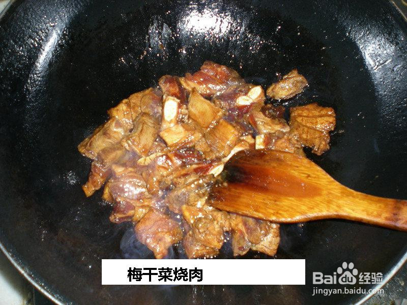 3、泡好的梅干菜攥干水分,放大碗里,加一勺生抽、一勺老抽、一勺白糖,2勺植物油,拌匀,上锅蒸,至少蒸20分钟,充分入味。