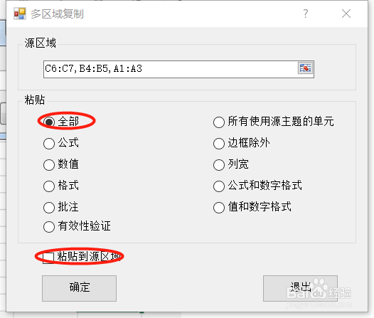 5、此刻,会出现一个多区域复制的对话框,我们点击“全部”,并取消“粘贴到源区域”,最后,点击“确认”。
