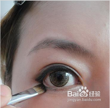 7、接着用刷子蘸取浅灰色眼影,刷在双眼皮处。然后在下眼睑后眼角眼线处刷一点。