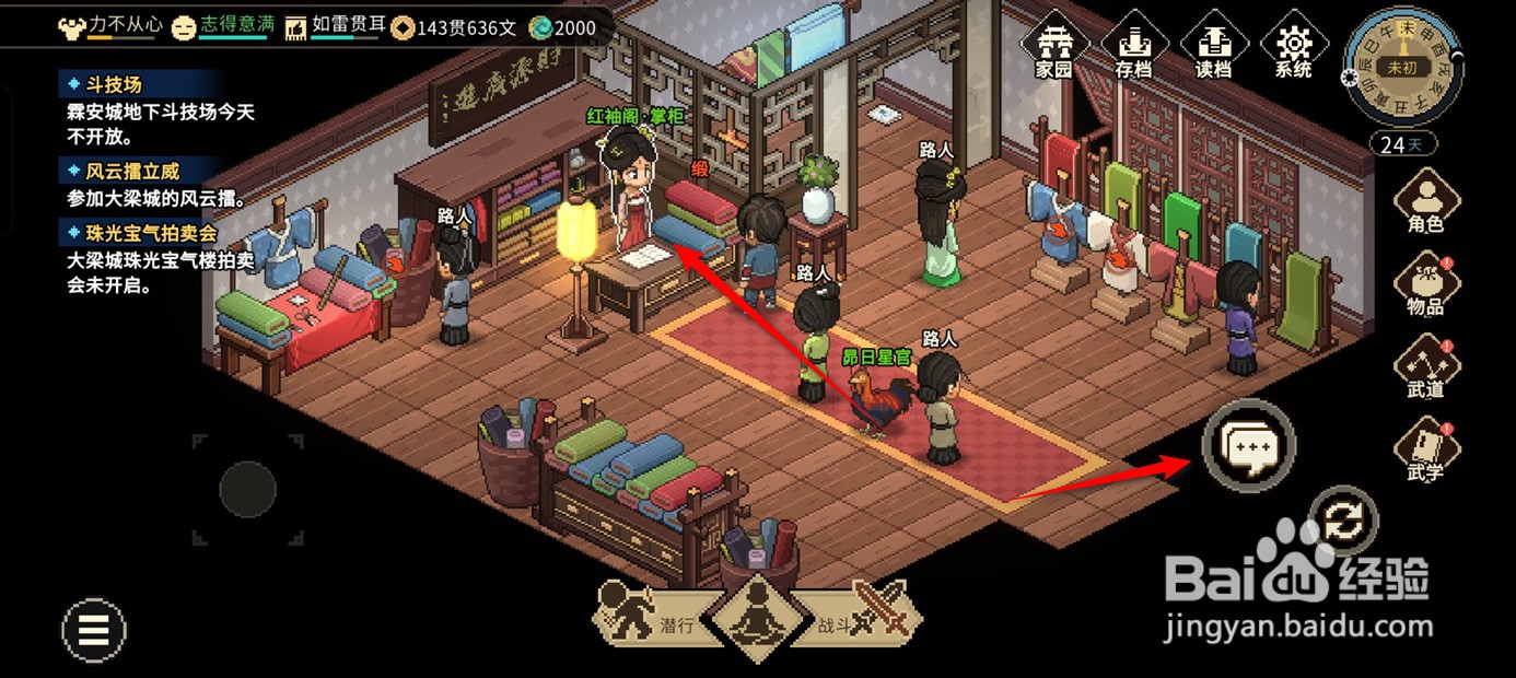1、在大侠立志传手游,来到楚襄城红袖阁,点击与掌柜对话。