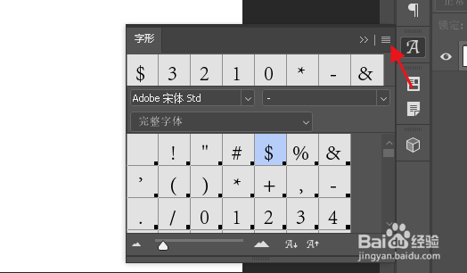 2、在“字形”面板点击右侧的横线图标,如图所示。