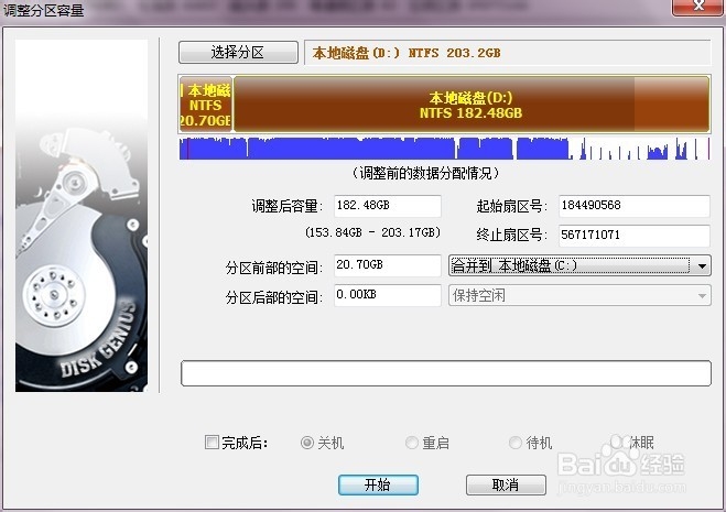 3、然后点击“开始”,会有一个提示窗口显示本次无损分区调整的操作表步骤及一些注意事项,若相信你的硬盘无问题可直接点“是”。