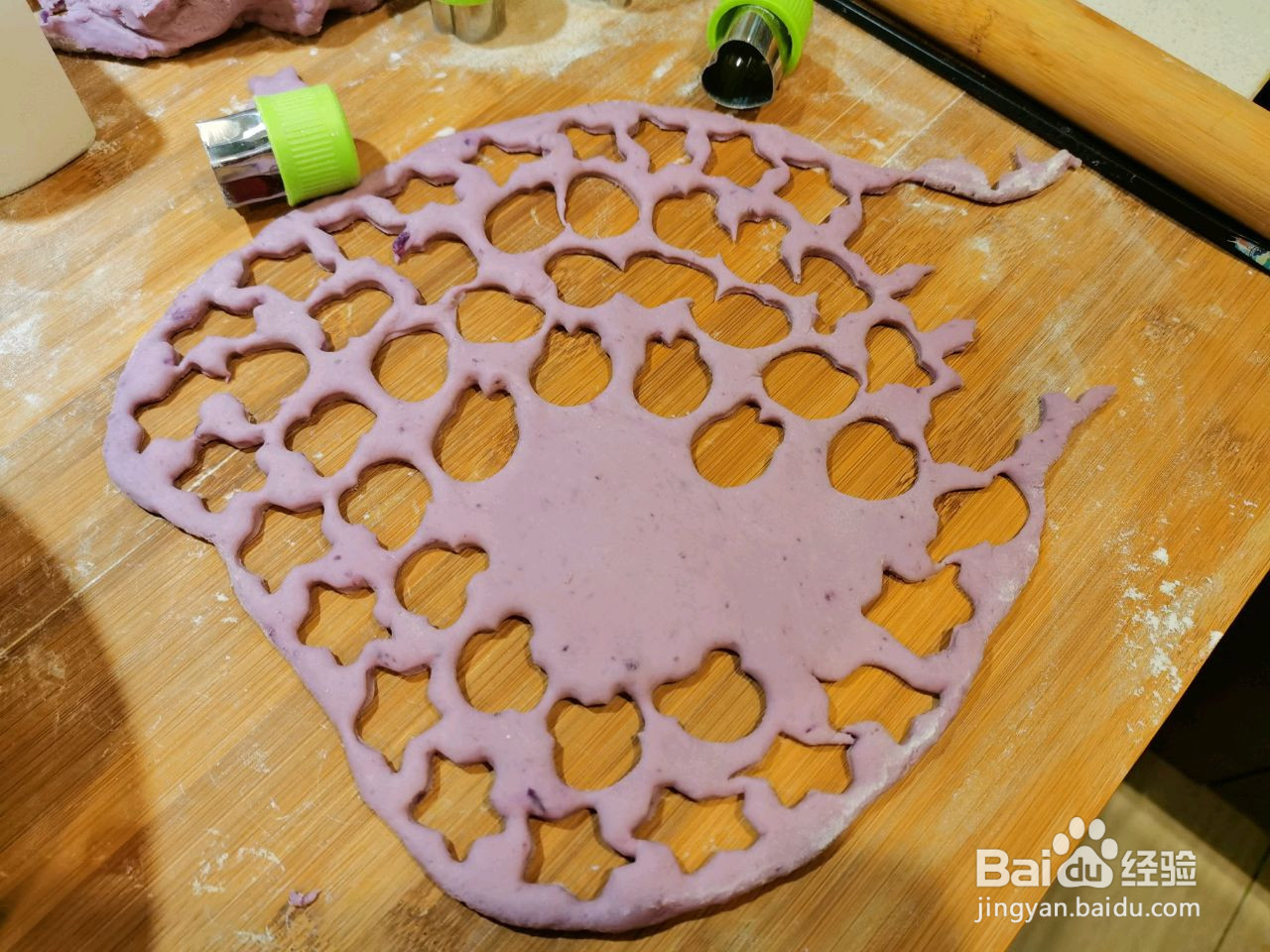 5、取出面团,用擀面杖擀成面饼的样子(不要太薄)。 用平时给宝宝做饼干的模具,按压出各种各样可爱的模型。