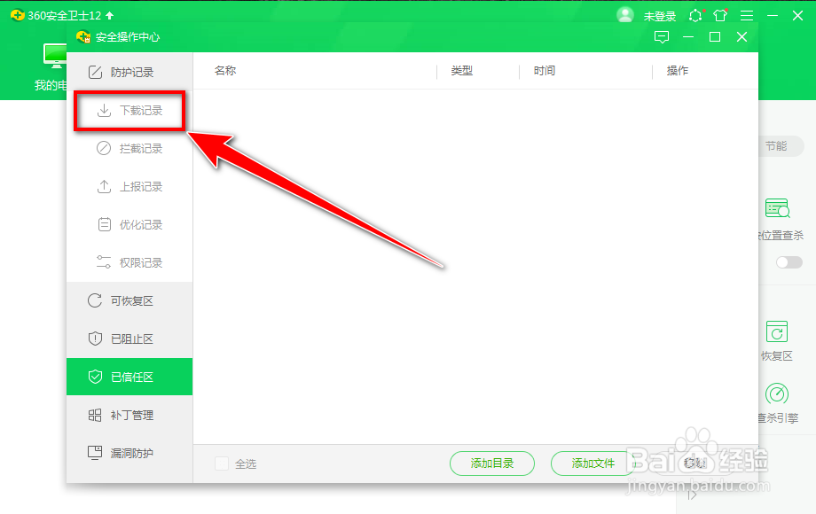 3、在“安全操作中心”的窗口中,点击“下载记录”。
