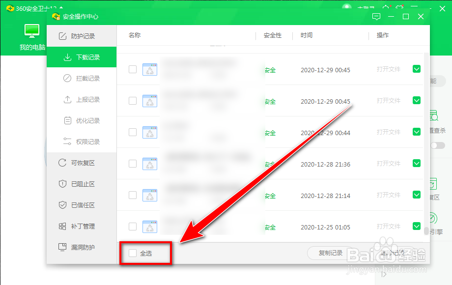 5、将滚动条拉到最底下后,点击“全部”前面的方框,即可选中全部下载记录。