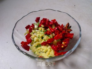 5、葱姜切末红辣椒切圈备用。
