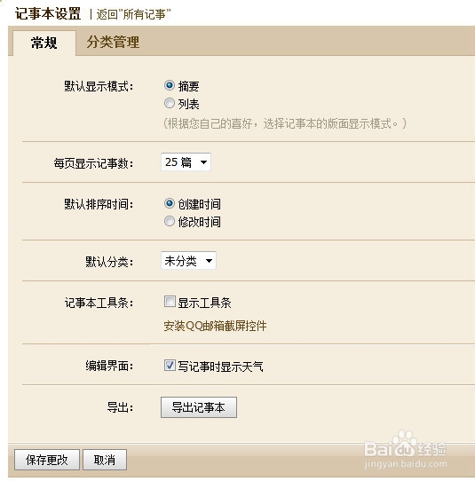 6、打开了记事本设置窗口,可以设置记事本分类,显示模式,编辑界面显示天气等