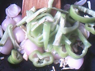 3、青椒切圈。青椒旁边的东东大家可以漠视。那是西兰花巨大的“梗”,(因为我们这里卖西兰花就是带巨大的梗卖的,菜贩子也不能赔钱吧)其实把外皮扒掉,里面的梗还是嫩嫩的,脆脆的,炒菜很好吃的。