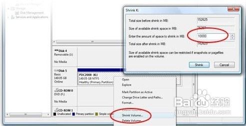 2、Step 2: 在操作系统找到USB硬盘,容量149.05G,压缩这个卷,压缩卷大小10000MB.