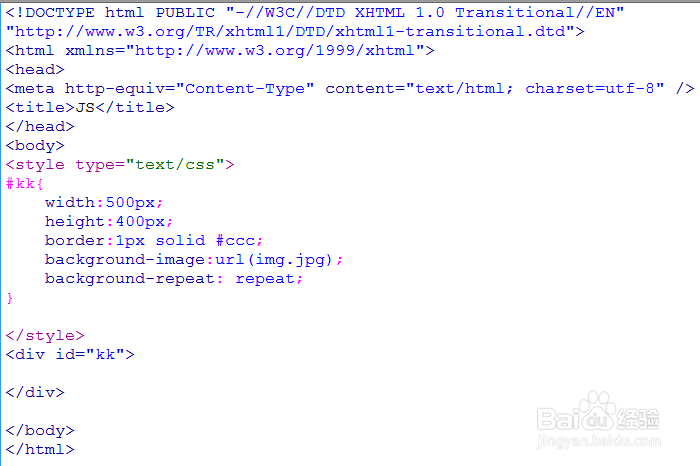 3、为div元素设置一个重复的背景图片,铺满整个div元素。主要通过设置background-repeat: repeat来实现 。