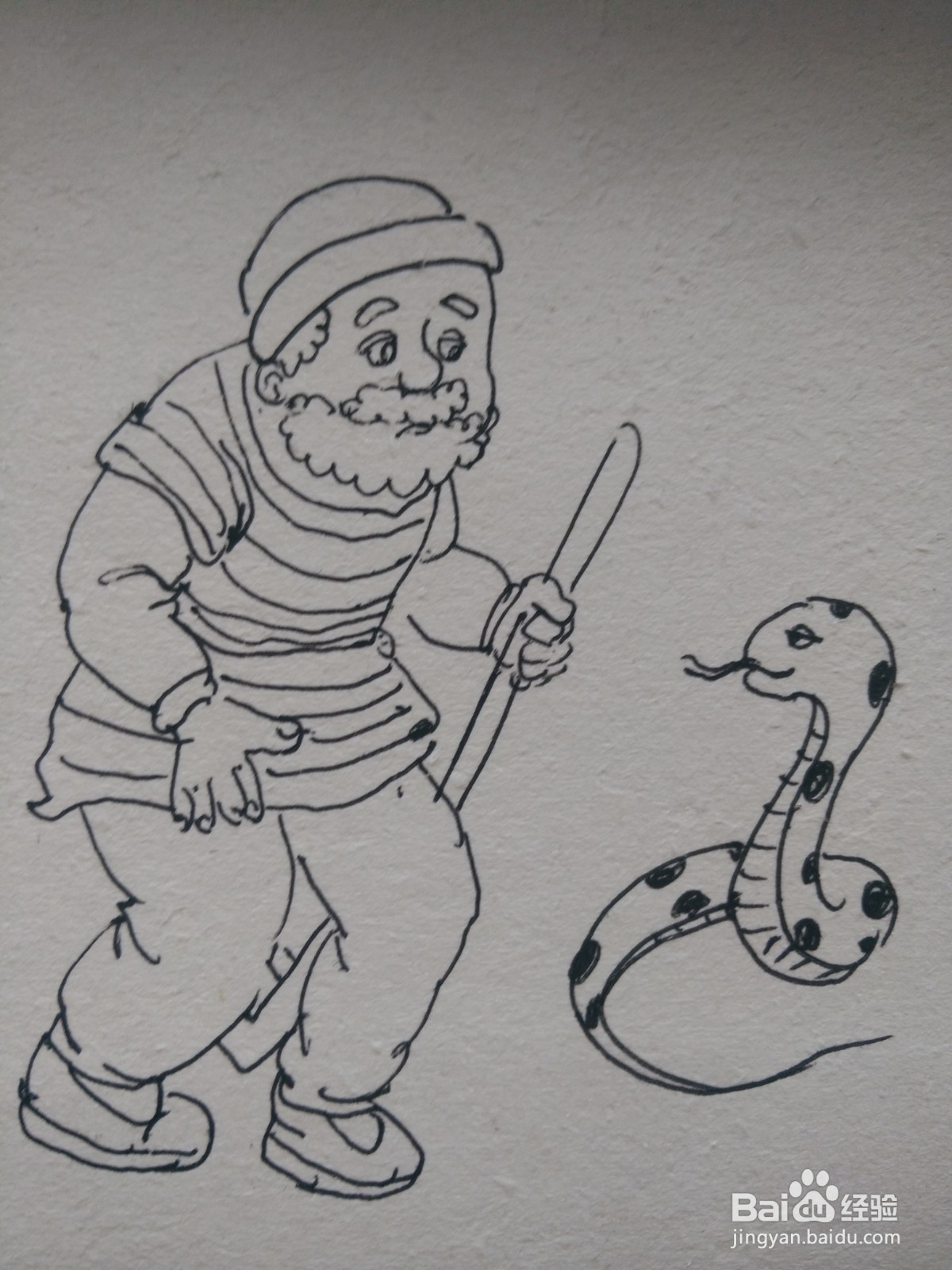 4、第四步画出农夫的衣服和衣服上的条纹。