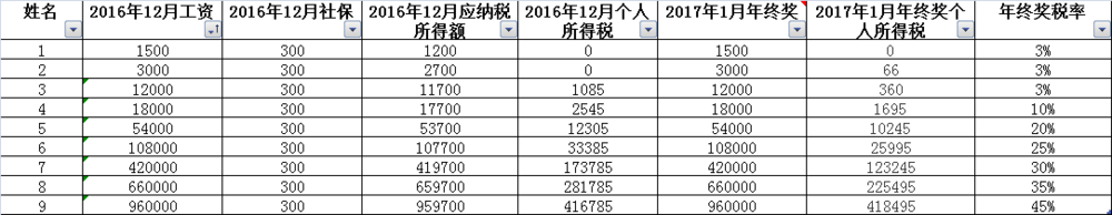 2、姓名1,2016年12月应纳税所得1200+2017年1月年终奖500=2700<免征额3500,个税为0