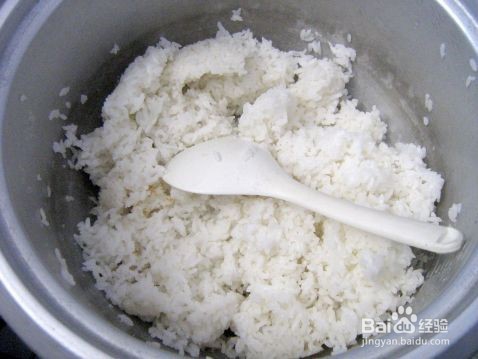 1、先把饭给用铲子弄碎一点,稍微撒上一点点盐;