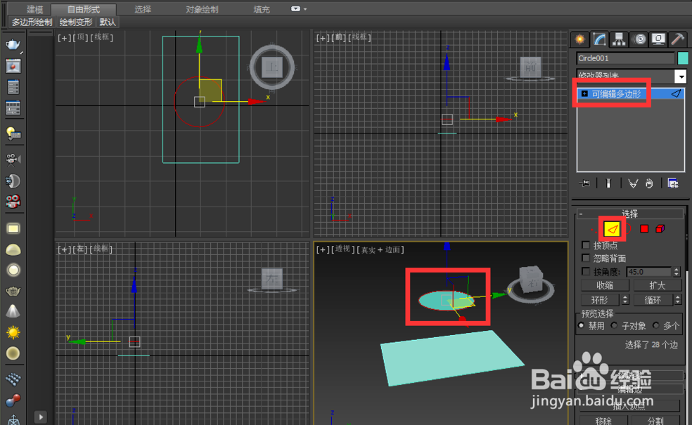2、右键点击选择圆形,转换为可编辑多边形,提取出来边要。因为布尔运算会导致很多不需要的的线。所以我们选择用复合对象中的图形合并。