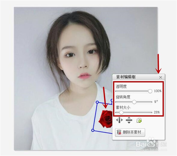 6、接着在“素材编辑框”中,对透明度,旋转角度和素材大小进行设置,设置完按“确定”,我们就可以看到呈现出来的效果图了。