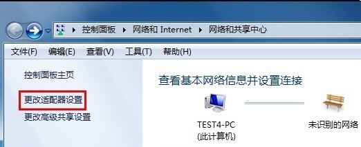 2、打开 网络和共享中心 的界面,点击 更改适配器设置。如下图所示: