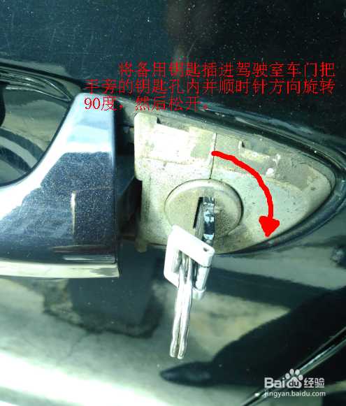 6、如下图:将备用钥匙插入钥匙孔内,并顺时针方向旋转备用钥匙90度。此时可以透过驾驶室车门玻璃看见门内上方红色信号灯闪烁。