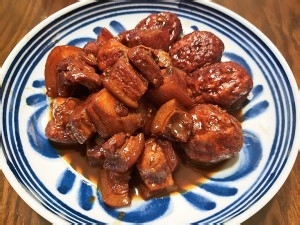 1、五花肉洗净,改刀切成3厘米见方的块。
