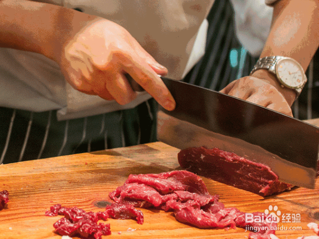 1、把刀用热水先烫一下,比较好切,牛肉质老(即纤维组织),筋多(即结缔组织多)