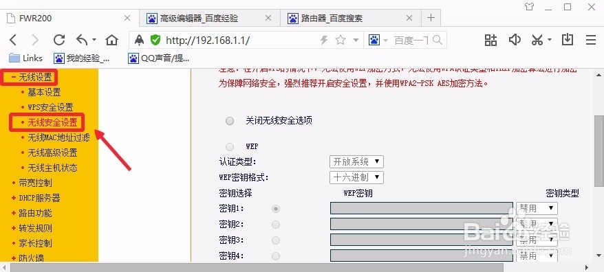 3、这时候我们打开无线设置的无线安全设置,这里我们将自己的WIFI密码设置复杂一些,这里我们不要使用这里的WEP,我们这里选择WPA2-PSK然后AES加密算法,并且我们这里将自己的WIFI密码,不要设置太简单,建议数字字母符号等的组合,最后点击保存按钮,让自己的设置生效。【这个方法常用且重要】